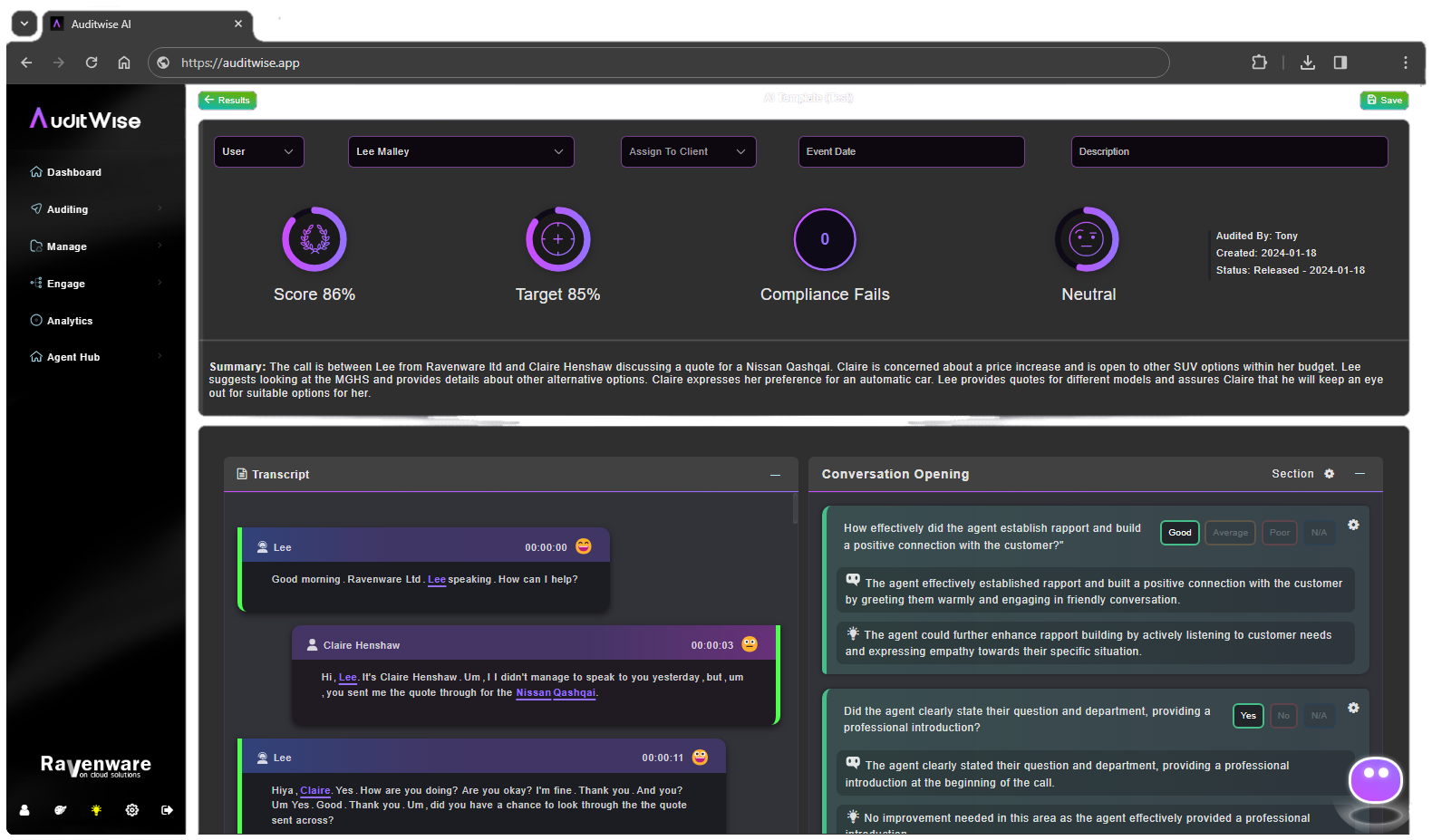 At AuditWise, we understand the importance of delivering exceptional service and maintaining high quality standards on every call. That’s why we have developed AuditWise, a state-of-the-art AI-driven quality monitoring system designed to help businesses of all sizes gain insight into their calls. Whether you are looking to increase sales, understand customer experience or identify compliance adherence, AuditWise can provide you with actionable insights into your challenges.